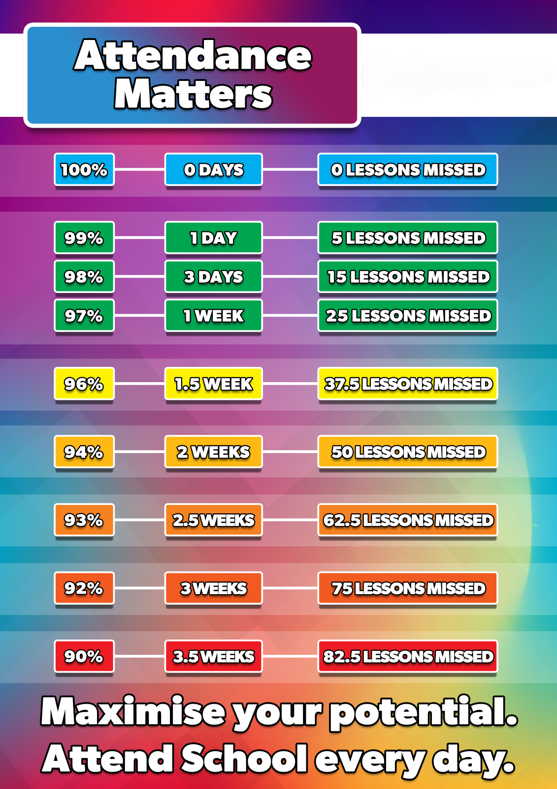Over a period of five school years, a pupil with 90% attendance will have missed half a year of schooling. Similarly, pupils with poor punctuality miss valuable lesson time and, if it happens regularly, progress will be jeopardised.